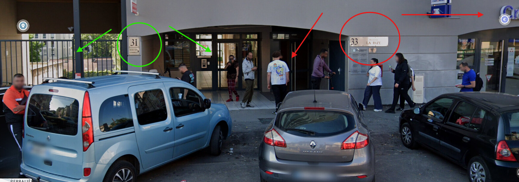 Voici en PJ une capture d’écran de street view: j’ai mis en rouge le 33 avec la flèche vers la porte d’entrée de l’immeuble et à droite on voit le crédit mutuel au RDC; en vert le 31 affiché sur l’immeuble où on voit à droite le hall fermé mais qui donne accès seulement à la passerelle piétonne que l’on voit par transparence, puis à gauche la rampe pour parking : je ne sais pas s’il est pour les 2 adresses ou non sur ce dernier point…