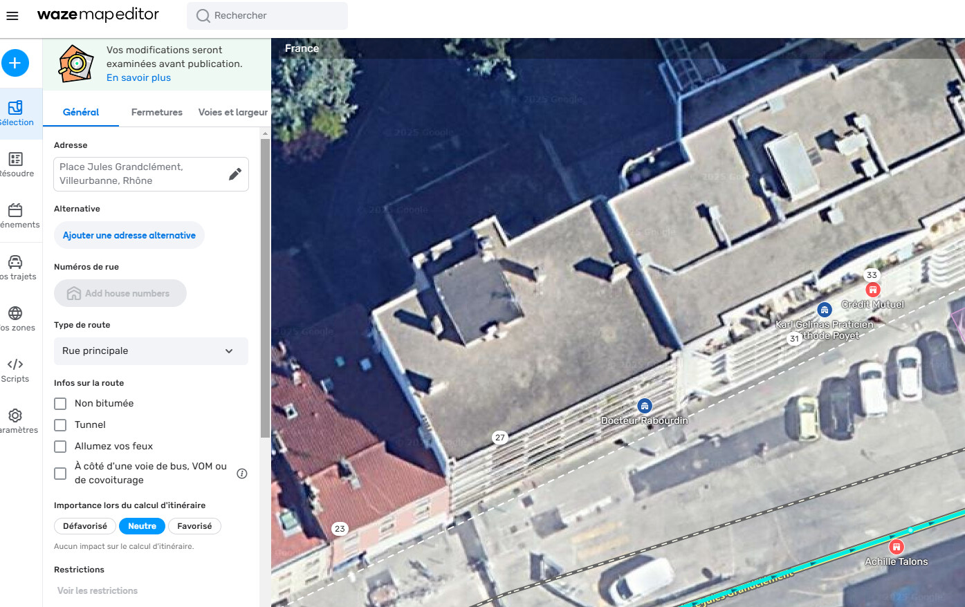 Merci d’avoir débloqué, j’ai pu ajouter mon établissement au 33 pl Jules Grandclement. Par contre je ne peux modifier les num de la rue (il me semble qu’ils n’y étaient pas lors de ma demande, je voulais justement en ajouter…) afin de corriger le 31 de la Place (c’est un immeuble derrière le 33 accessible par passerelle qui part d’un hall traversant le 33 - il s’agit d’une école).