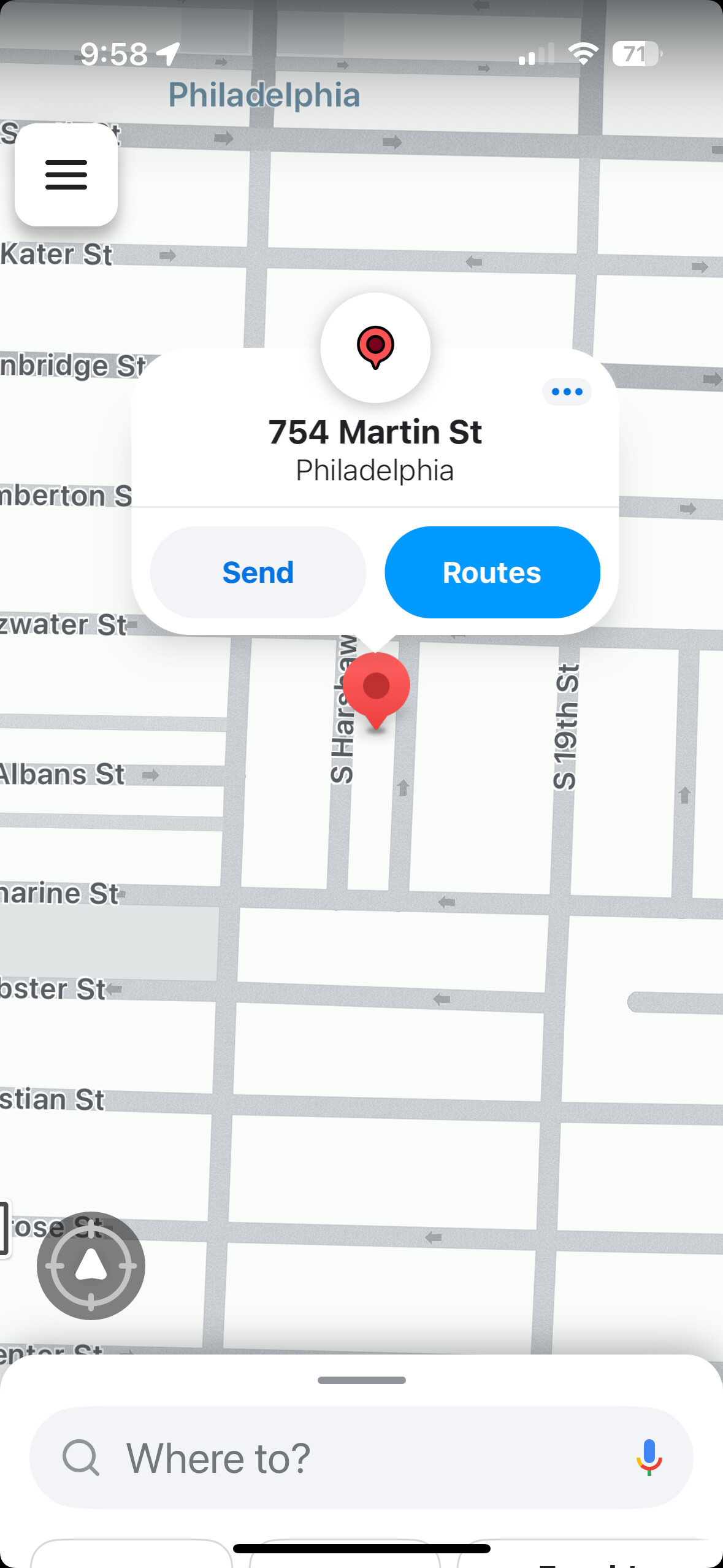 I notice that Waze has the Street named “S Martin St” not “Martin St”. I see that Philadelphia GIS has it listed under both names. I have added an Alternate name of Martin St. If you were previously entering Martin St and not “S Martin St”, then you were getting a Google Maps result fed to Waze. Additionally, if you include the Zip Code in an address search, you also get the Google Maps result NOT the Waze result. Waze does not recognize zip codes and thus passes the request off to Google Maps for resolution. Give the changes a few days to take effect and then you MUST delete previous searches for this address including HOME if you have it set from the Waze App. In 2 days, delete this address from Waze history and try searching for it again by typing it into Waze. Let us know if it works correctly . Thank you. This is what I get when using Waze ti find your house