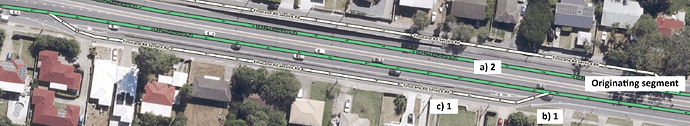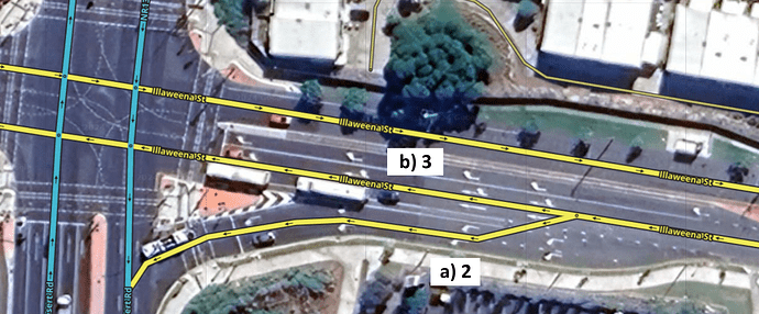 - b) The continuing primary street segment is three lanes wide. The road width is set to three lanes (even though there is a dedicated right turn lane).
