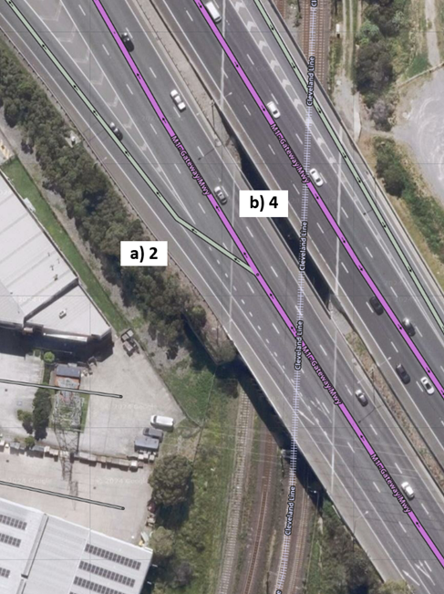 - b) The continuing motorway segment is four lanes wide. The segment width is set to four lanes.