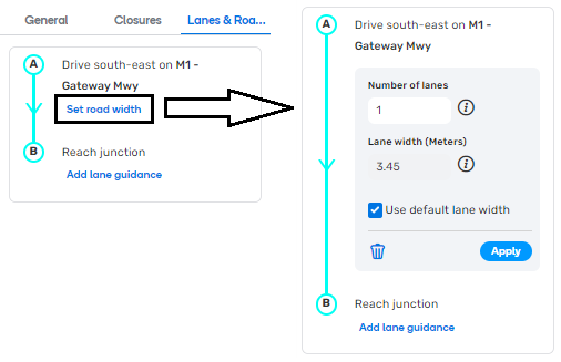 The road width interface can be accessed by selecting a segment, and in the edit panel, select the “lanes & road width” tab, then select set road width. After setting the number of lanes for road width, ensure to select “Apply”.