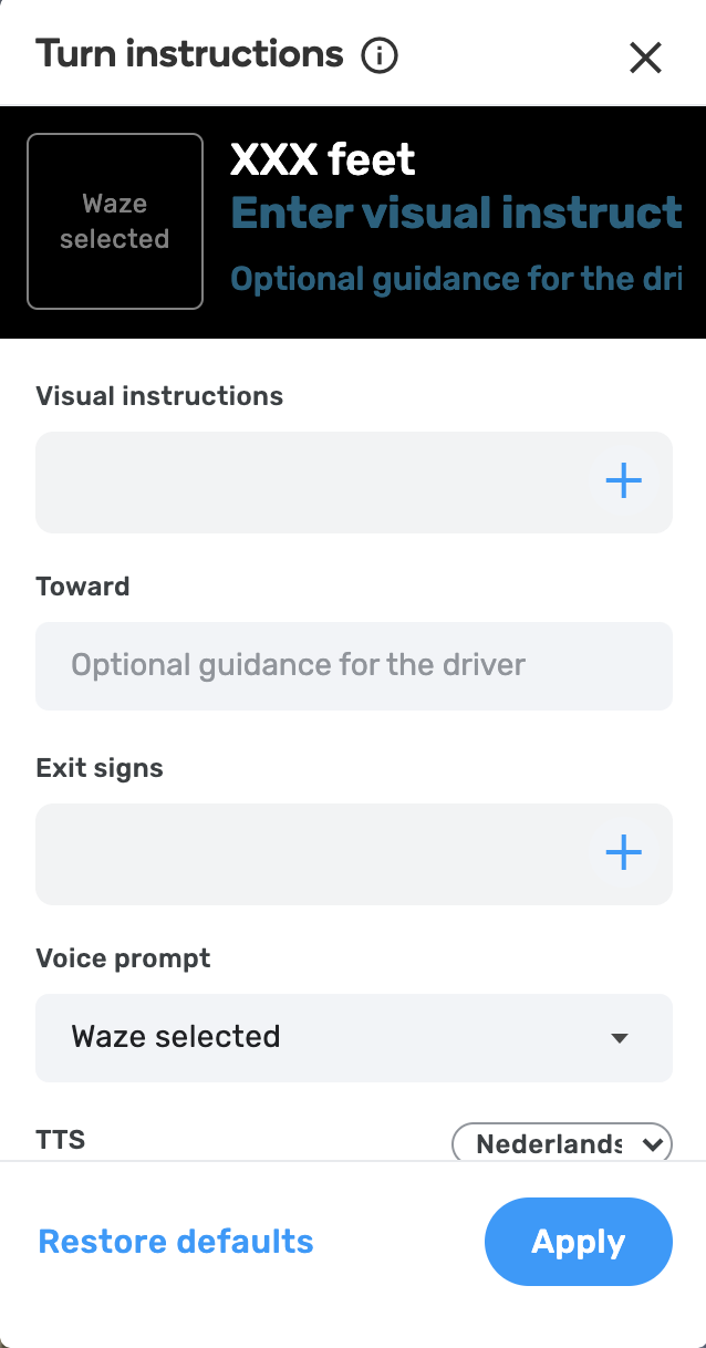 You will be able also to control the voice prompts and (effectively replacing the road name) in the TTS. IMPORTANT: The TTS override should only be used as an indication to the driver as to where (street name) they should be turning to. In case you’d want to use the TTS override for any other purpose, please contact your CM beforehand and make sure you have their approval.