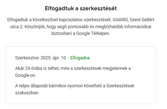 Ja, és még egy apróság! Google utcaképen nem látom a házszámot! Ez minket szerkesztőket nagyon hátráltat, hiszen mi is abból tudjuk többnyire, mi a pontos cím! Kérlek tegyél ki házszámot!