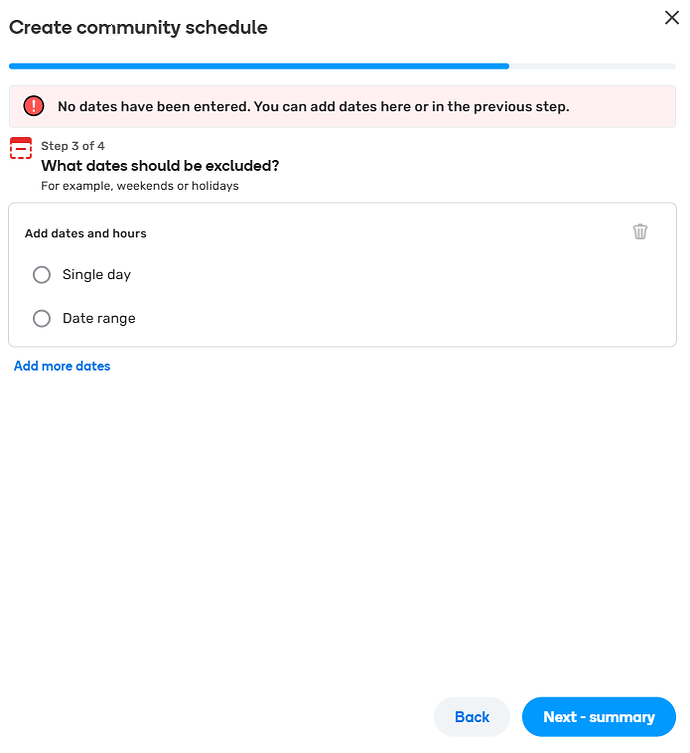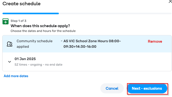 | Step 3 - Configure what dates to exclude | This step allows you to define what dates the schedule will exclude. We refer to it as the "OFF" schedule. If your schedule is an ON, you will select trash bin icon to remove the Add dates and hours otherwise proceed to populate either single days (public holidays or data ranges (school term holidays). You can refer to the previous examples for further guidance Periods in which this Off-Community Schedule does not operate should be entered here. This is typically, school and public holidays. Remember, these apply to all school zones where this Off-Community Schedule is applied. Note that public holidays are frequently, but not exclusively, included in school holidays. Do not use the “Repeats yearly” feature for school holiday periods, though consider it for public holidays that without a doubt always reoccur on the same date every year. E.g. ANZAC is always the 25th of April. Where a single day is selected, utilise the “All day” setting where possible, to minimise complexity. Consider if there are any changes to public holidays (new, removals or moves) during yearly maintenance of the schedule. Add a description: In Australia, this field is required. Briefly describe the period entered and any considerations included. E.g. “2025 Autumn (including Easter PHs)” Select Next - summary to continue |