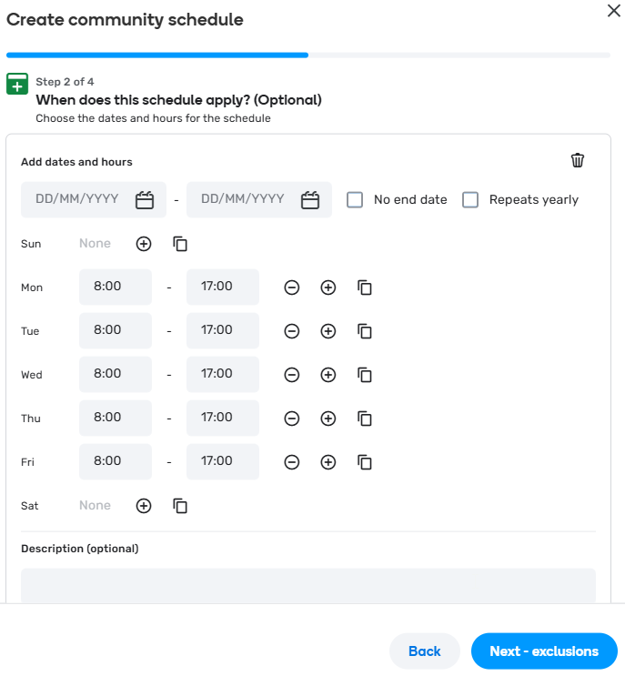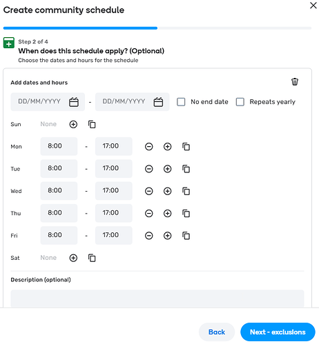 | Step 2 - Configure when the schedule applies | This step allows you to define when the schedule will apply. We refer to it as the "ON" schedule. If you are not creating an ON schedule you select the trash bin icon to remove the Add dates and hours dialogue. You can then proceed to Next - exclusions to set up the OFF schedule. If your schedule is an ON, you can refer to the previous Examples for further guidance School Zone operation hours should be entered here, that is, the various times as displayed on school zone signs. Remember, these apply to all school zones where the On-Community Scheduler is applied. Avoid using date ranges. Instead, set a start date as the date the schedule was created, with the “no end date” box selected. This is to avoid the schedule ceasing to operate should it not be maintained. Add times for each day. Use the + or - buttons to manage multiple timeframes for each day. Use the copy feature to copy the times from one day to all other. Remember to delete Saturday and Sunday times when using the copy feature. Select Next - exclusions to continue |