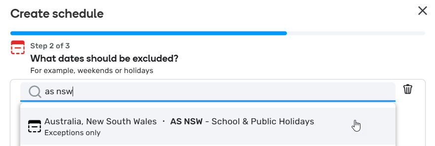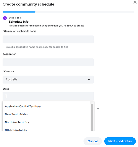 You must add at least one existing Off-Community Schedule, which is a Centrally Managed Community Schedule, using the search box at the top of the “what dates should be excluded” screen. For example, type “AS NSW” to list all the Off-Community Schedules for NSW.