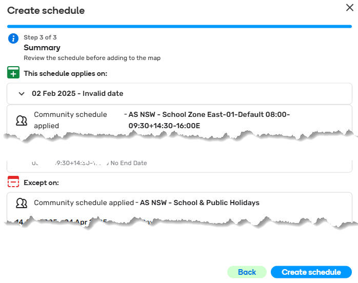 - Check the summary includes only Centrally Managed Community Schedules and that no School Zone Based Individual Schedules are applied, then click “Create schedule”, and click Save to apply the new Centrally Managed Community Schedules to the School Zone.