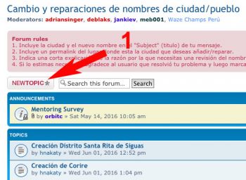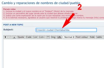 2. Incluye el nombre de la nueva ciudad en el “Subject” (titulo) del nuevo tópico. Cuando el nombre del distrito que vas a crear ya fue asignado a otra ciudad, agregamos el nombre de la provincia al nombre de la ciudad. Por ejemplo, San Luis de Cañete es la denominación que usamos para el distrito de San Luis en la provincia de Cañete.