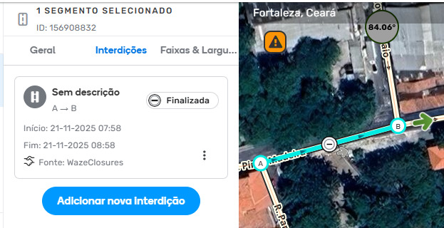 No Editor de Mapas do Waze (WME), as Interdições em Tempo Real são usadas para restringir temporariamente o tráfego devido a eventos locais, obras, incidentes viários e outros motivos. O WME exibe tanto o status atual de uma interdição quanto o seu status histórico. Isso resolve limitações anteriores relacionadas à exibição do status em tempo real e ao uso de diferentes dados do mapa, permitindo que os editores revisem os detalhes da interdição e sua linha do tempo mesmo após o horário programado para o término.