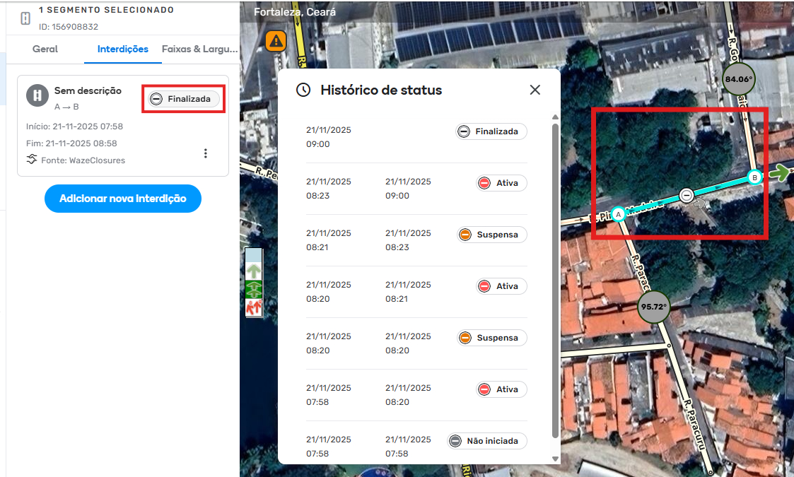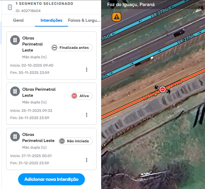 Segmentos com interdições exibem um ícone do status atual diretamente no mapa e no cartão da interdição, oferecendo uma visão rápida das restrições de tráfego em vigor.