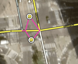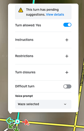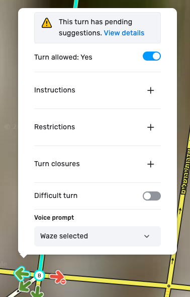 - After submitting your suggestion, a map marker will be displayed at the center of the affected segment. The turn visualization will revert to its original state until the suggestion is approved.