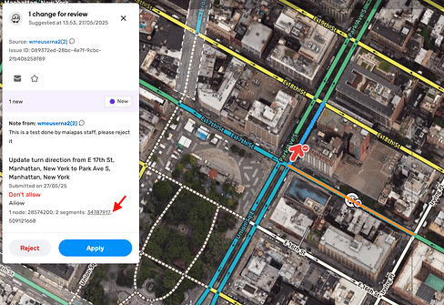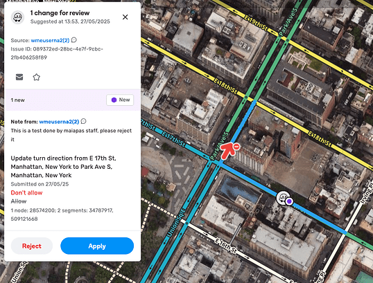 - “Apply” will allow you to load the suggested edit onto the map, make any necessary adjustments, and then approve the change.