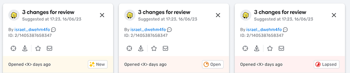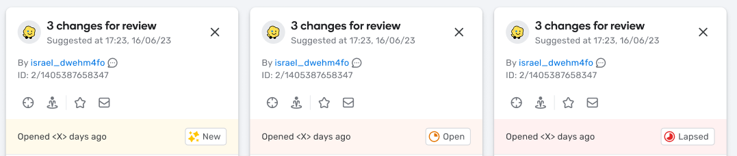 - The issue card will display the original state of the turn and the suggested changes. It will also include any notes from the suggesting editor.