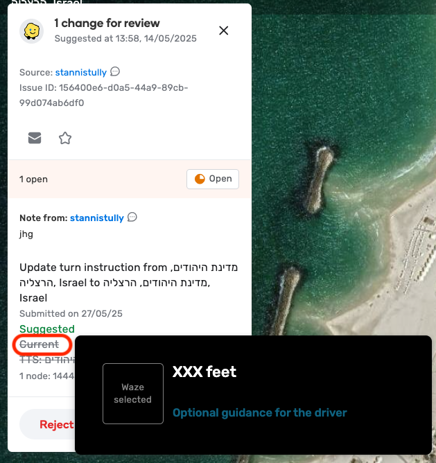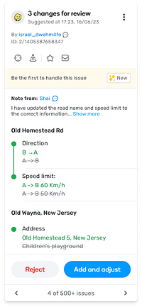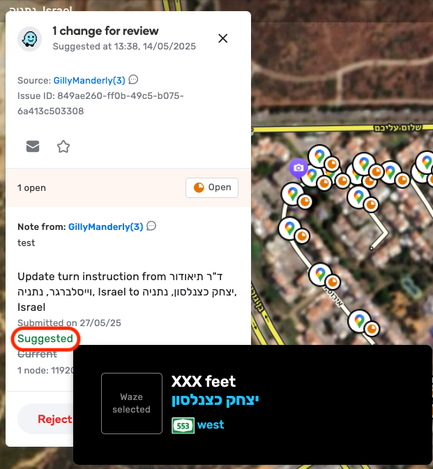 - When you interact with a turn that has a pending suggestion, or click on the “Suggest an Edit” marker, an issue card will open, detailing the proposed changes. The turn arrow on the map will visually grow to represent the new suggestion.