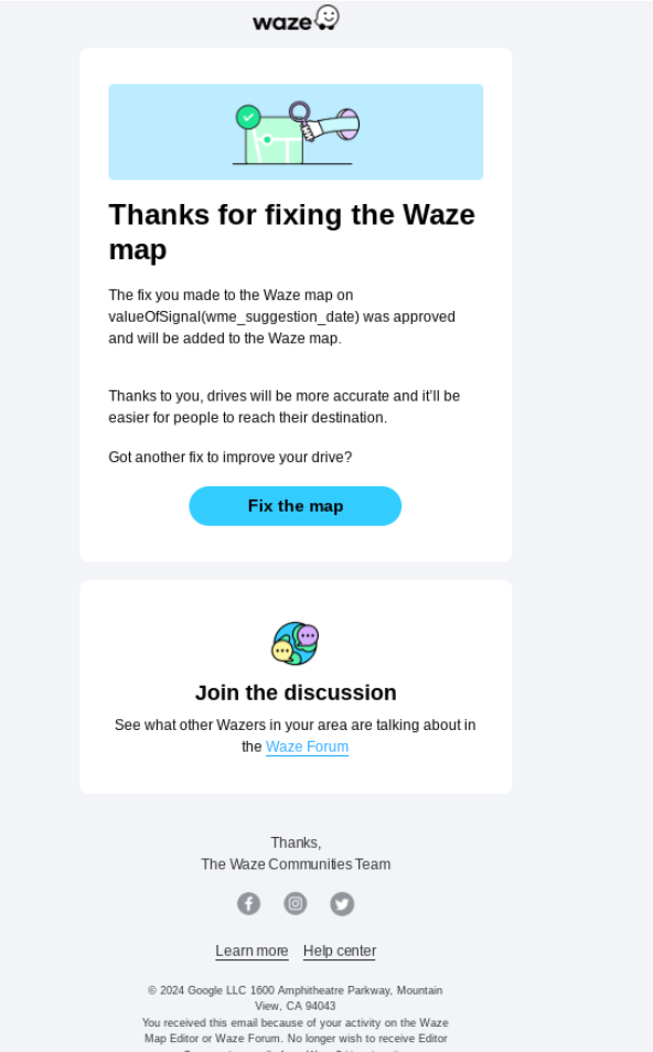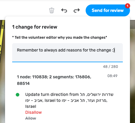 - You can communicate directly with the editor who made the suggestion via Waze chat to provide guidance or ask for clarification. We encourage you to be empathetic and helpful, especially to new editors.