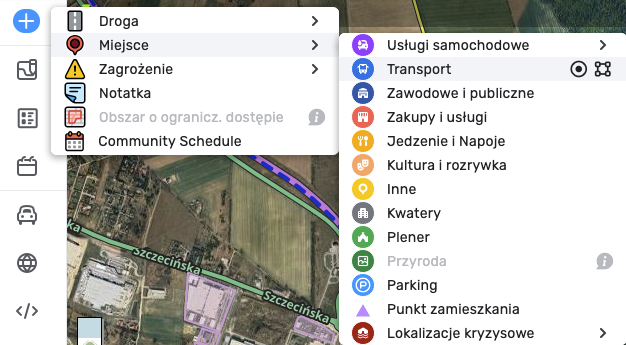 - W menu na pasku narzędzi, wybierz odpowiednią kategorię (można zmienić później) oraz rodzaj (punkt/obszar) korzystając z dwóch ikonek przy każdej kategorii