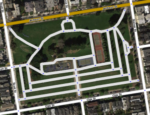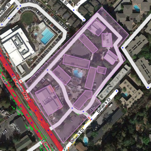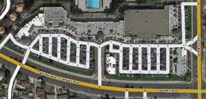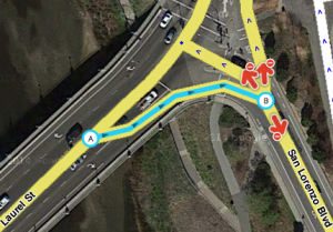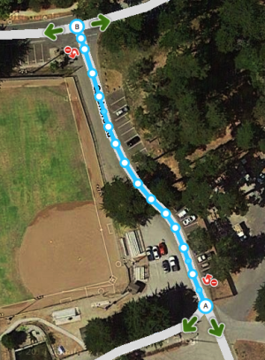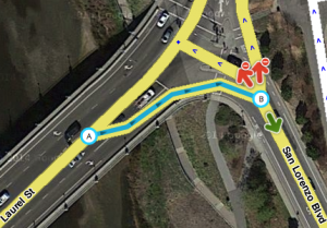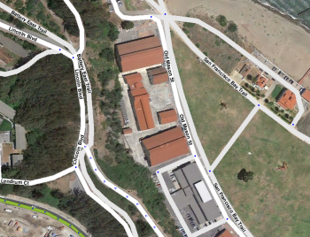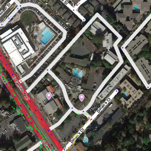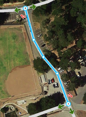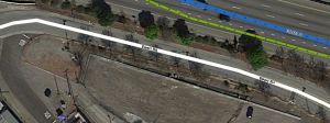 Препокриващи се сегменти. Част от улицата е затворена за неупълномощени превозни средства. Редакторът е направил опит да представи това с еднопосочен сегмент тип “частен път”, който се отделя от улицата доста рано, и почти съвпада с основната улица. Waze няма да има представа по кой път се движи шофьора и за кой сегмент да приложи данните от скоростта.