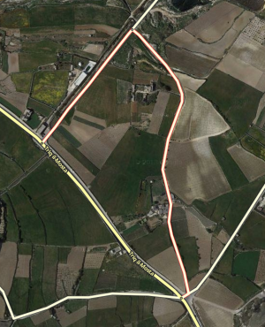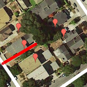 Подход, който ще наруши маршрутизирането. Нов редактор е добавил подход към един от частните имоти. Този подход се приближава толкова близо до съседите си, че те ще бъдат насочвани до неговия подход всеки път като си пътуват до вкъщи. Този подход не подобрява маршрутизирането. Не коригирайте такива червени пътища, а ги премахвайте. (Маркерите на Google са добавени ръчно за прегледност)