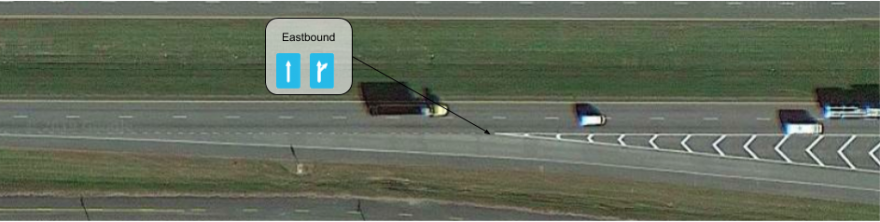 A: 회전하기 직전에 완전하고 일관된 폭을 달성하는 차선을 매핑하세요. 고속도로 출구 차선의 경우, 고어 지점 이전의 전체의 차로를 의미합니다. 왼쪽 차로에서 주행하는 사람이 차로를 변경하지 않고 계속 직진할 수 있는 경우 이를 직진/회전 차로로 매핑합니다. 운전자에게 도로가 어떻게 보이는지 고려하세요. 차로 안내 화면의 차로 수가 운전자에게 표시되는 것과 일치하도록 하세요.