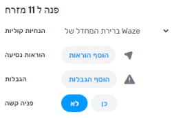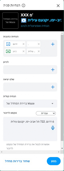 בשדה של ההנחיות הקוליות ניתן להגדיר סוג הנחיית פנייה שונה מברירת המחדל בלי להיכנס לחלונית של הוראות נסיעה (שגם שם יש שדה זהה). כשרוצים לשנות לא רק את סוג הנחיית הפנייה, אז יש צורך ללחוץ על לחצן “הוראות נסיעה”, ואז מתקבל חלון כגון זה (שחלק מהשדות בו כבר מלאים):