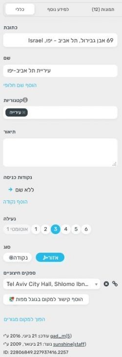 כאשר לוחצים על מקום כדי לסמנו מופיעים בחלק השמאלי של העורך פרטי המקום (ראה דוגמת פרטים של מקום רגיל מצד ימין ומקום מגורים מצד שמאל).
