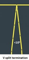 - יש יוצא מן הכלל לנקודה הקודמת: במידה ופיצול הצומת גורר הכנסת JB על הצומת (למשל בגלל בעיות ETA בפניה שמאלה עקב יצירת מקטע קצר מאד שממנו פונים שמאלה בצומת אשר לא מאפשר איסוף סטטיסטיקה טובה לזמן ההמתנה בפניה שמאלה שבפועל מתחילה במקטע שלפני כן), והכנסת ה- JB הינה בעייתית, ובצד השני של הצומת אין מקטע מפוצל, יש לשקול סיום הפיצול באמצעות צורת V בזווית חדה שהקודקוד שלו בצומת הראשון