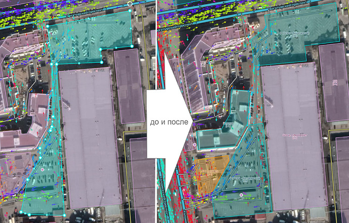 1. Лишние точки и излишне сложная форма. Форму парковки определенно можно упростить. Тем более такая форма все равно будет упрощена в клиенте (скриншот из клиента представлен на картинке справа). Лишние точки удаляем наведением курсора на точку с зажатой клавишей “D”.