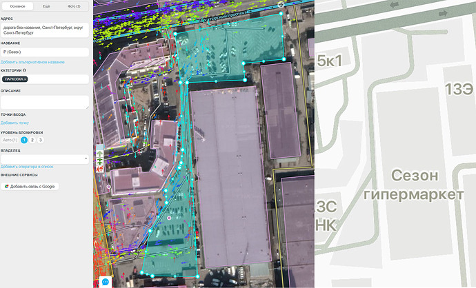 3. В северной части геометрия сегмета соответствует GPS-трекам. В нижней части также устранены некоторые проблемы: удалён несуществующий проезд с АЗС на парковку, добавлен проезд там, где он действительно есть. Не забывайте сверяться со StreetView, если он доступен и более-менее актуален.