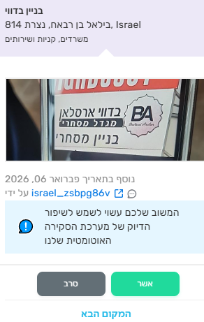 בנוסף, חשוב לי לציין שלפעמים באפליקציה עצמה מבקשים תמונה כדי לפתוח/לעדכן מקום, ולכן ניסיתי לפעול לפי הדרישות. גם הסברתי מראש שהטלפון שלי ישן והצילום יוצא באיכות לא טובה—עד כדי כך שלא נעים לי להציג את זה—אבל השתדלתי לפחות להביא צילום בסיסי של דרך ההגעה.