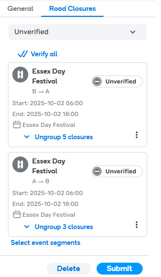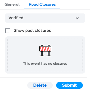 - In the Road Closures tab, it automatically defaults to Verified. Your past event closures are not yet verified. Click the drop down and select Unverified.