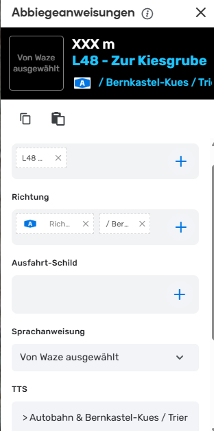 Das Feld ist dafür da von Waze gewählte Standardsprachanweisung zu überschreiben. Das Feld wird mit dem Sprachanweisung Dropdown (TIO) das es direkt auf dem Abbiege-Pfeil gibt, gesynced.