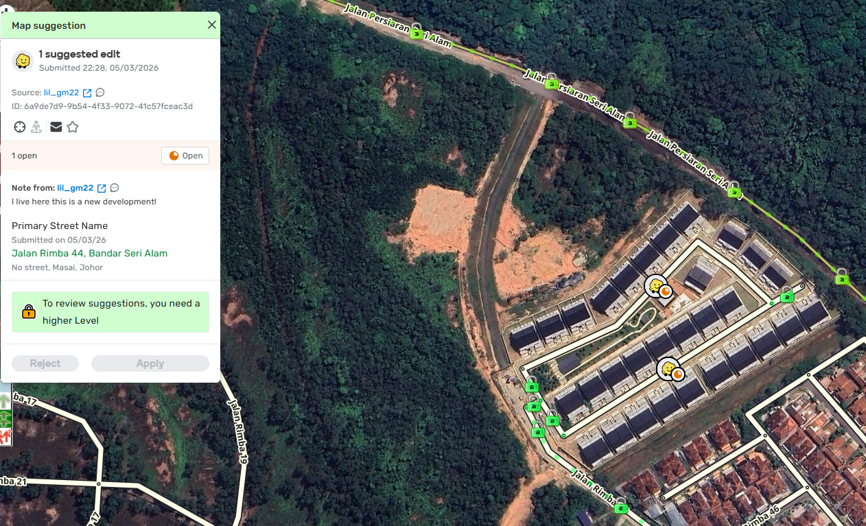 Hi @dinohoo , you cannot interact with this edit suggestion because it includes a suggestion to create a new city called “Bandar Seri Alam”, an action which is restricted to L5 in Malaysia.