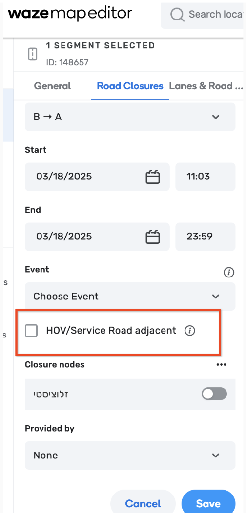 HOV/ Service Road adjacent WME feature: Closures marked “HOV” in the WME are never automatically suspended. Based on that, this feature should be used with increased caution