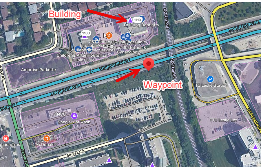 Hi, 1100 and 1110 Sheppard Ave are odd. They are totally inaccessible from Sheppard (i.e. driving, biking, walking, you cannot enter those buildings without climbing a wall or fence) because they are not at grade. Here is what it looks like: https://maps.app.goo.gl/H3MEbMCMpRhnFTEK8