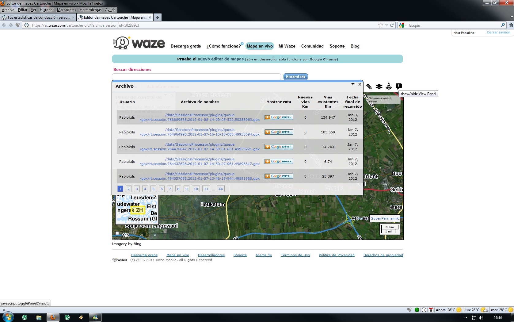 El problema es que no debes hacer clic en el nombre del archivo, sino en una columna que está a la derecha y que dice “mostrar ruta”. El problema es que esta columna no está apareciendo actualmente en es.waze.com debido a un problema de configuración (los nombres de los archivos son demasiado largos). Mientras tanto, te recomiendo que pruebes ir a tu archivo de rutas desde world.waze.com y ver si puedes hacerlo.