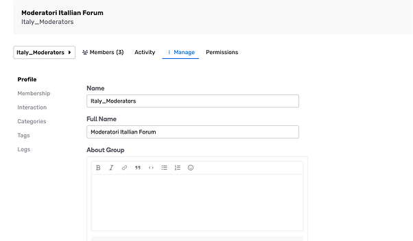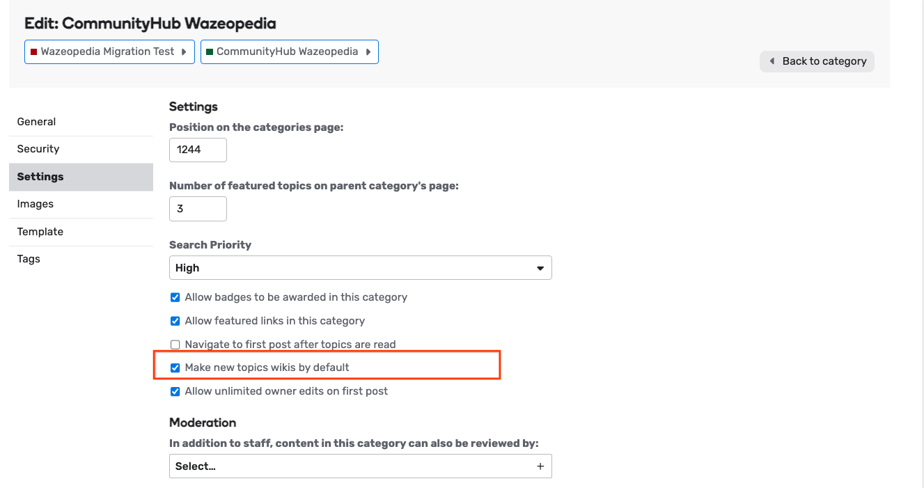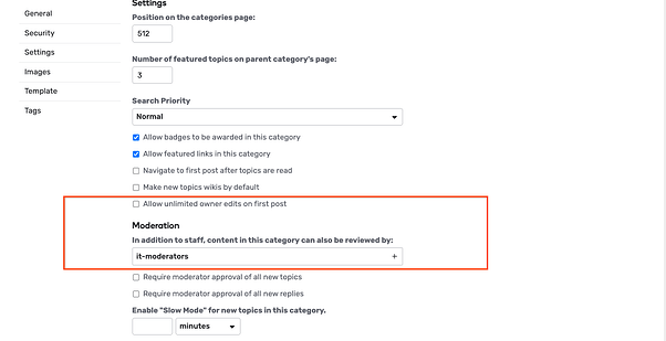 Moderation: If you’d like to grant a group of non-staffers moderators access to this category, add the group’s name in this field.