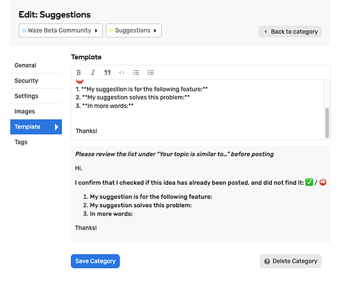 - Waze forms: Staff only - If you’d like to embed a Waze Form (like the Beta Bug form) in this category, check this box.