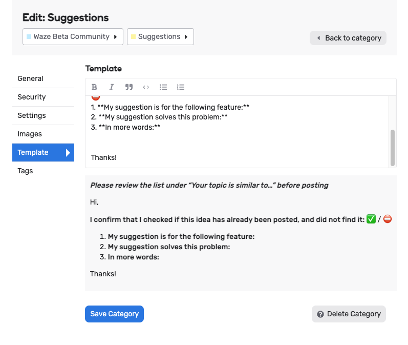 3. Parent category: VERY IMPORTANT - nest your category under the right parent category. If you don’t, your category will appear on the [main page](https://www.waze.com/discuss/).