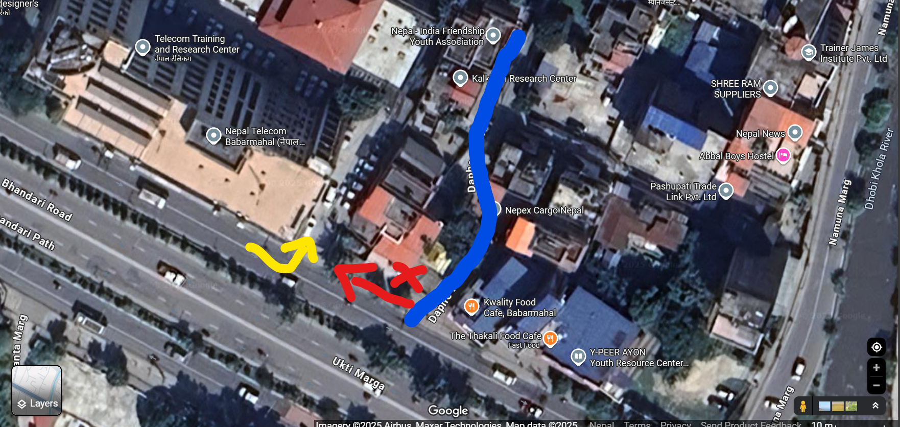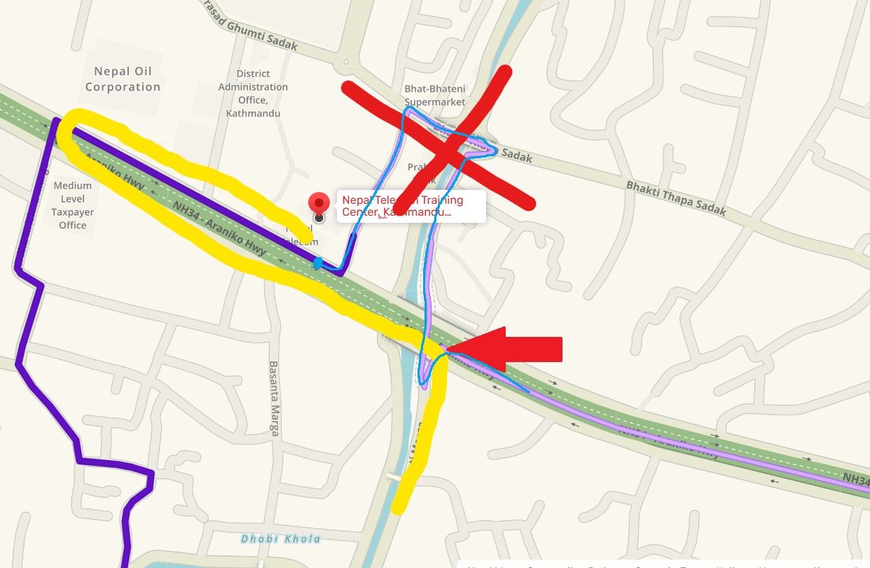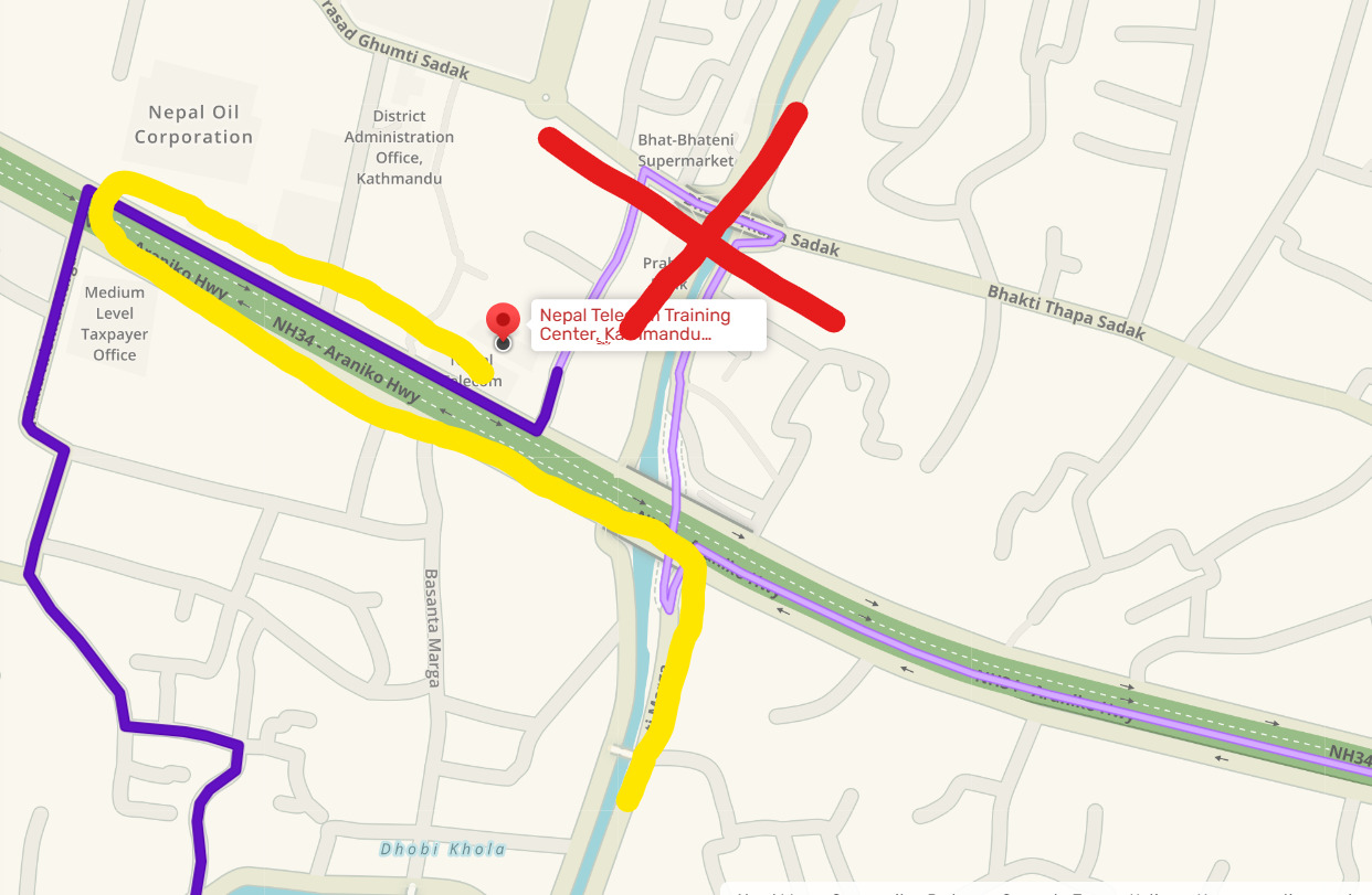 For the entry point of Nepal Telecom, the path from Art Council (I have added another path as well from the one shown already) is okay… but the another path (I have selected in red) is wrong… We need to move from footpath if we follow that path… Telecom entry is further from the road it suggests.
