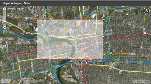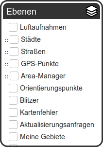- Rechts befindet sich eine Box, die nur erscheint, wenn etwas geladen wird. Karte lädt, Speichern, Straßen laden etc. Daneben die Layers-Auswahl.