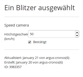 Wenn ein Blitzer ausgewählt ist, erscheint nur ein Reiter, der Dir erlaubt die Geschwindigkeit zu erfassen. Wenn Du den Blitzer am richtigen Ort platziert hast, musst Du auch “Bestätigt” anklicken, um den Blitzer zu bestätigen. Ist ein Blitzer nicht bestätigt, erscheint er auch nicht auf der Karte. Rotlicht-Blitzer brauchen keine Geschwindigkeitsangabe.