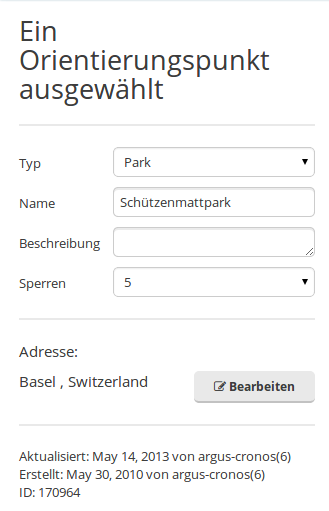 | Wenn ein Orientierungspunkt ausgewählt ist, erscheint nur ein Reiter, der Dir erlaubt den Orientierungspunkt zu benennen, einen Orientierungspunkt-Typ zu vergeben und den Orientierungspunkt mit einem Lock zu versehen. Der Lock hindert Editoren mit niedrigeren Stufen (Rechte) den Orientierungspunkt zu verändern: | Darunter befinden sich die Eigenschaften der Adressdetails. Klick auf Bearbeiten und ändere die Details klick auf Übernehmen, wenn Du alles eingegeben hast: | |
