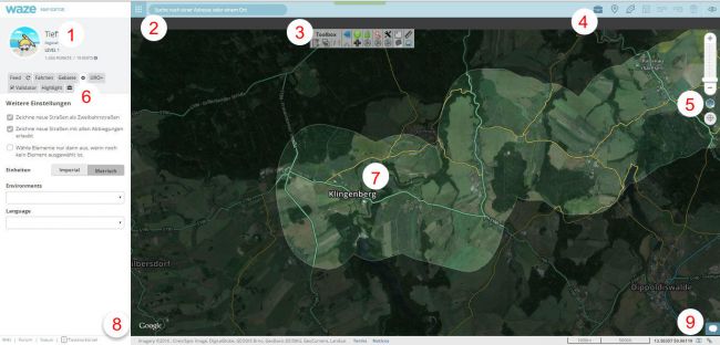 - die Personalisierung - Anzeige Deines Nicknamens und einer logout-Schaltfläche. Weiterhin bekommst Du den Editorenlevel, Deine Punkte und die Anzahl Deiner Kartenedits angezeigt. Wenn Du mit der Maus über dem kleinen angehängten “i” hinter der Editzahl verweilst, erhältst Du ausserdem eine Anzeige Deines möglichen Editierradiuses um das Gebiet Deiner mit Waze gefahrenen Strecken.