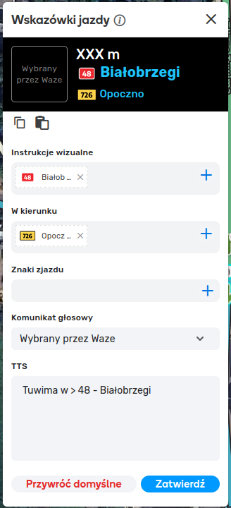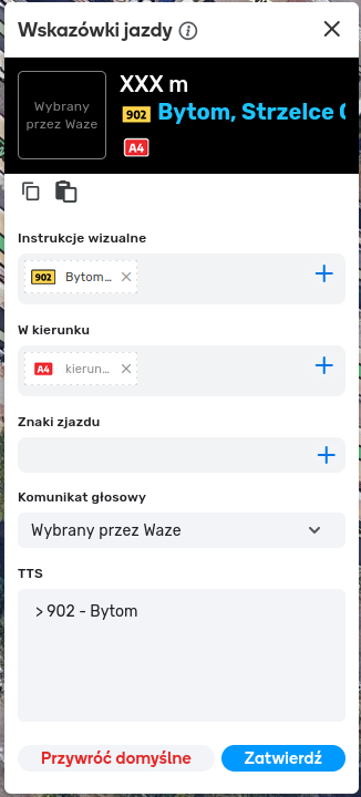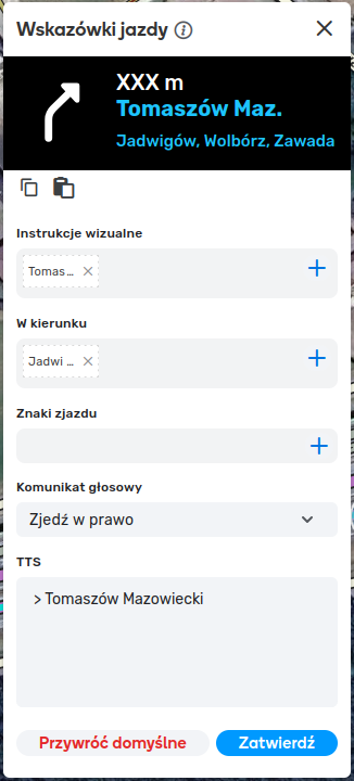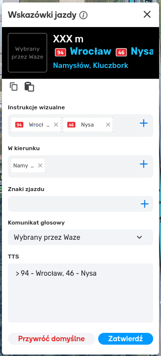 Informacje wpisane w okno wskazówek muszą odpowiadać rzeczywistej tablicy kierunkowej na drodze.