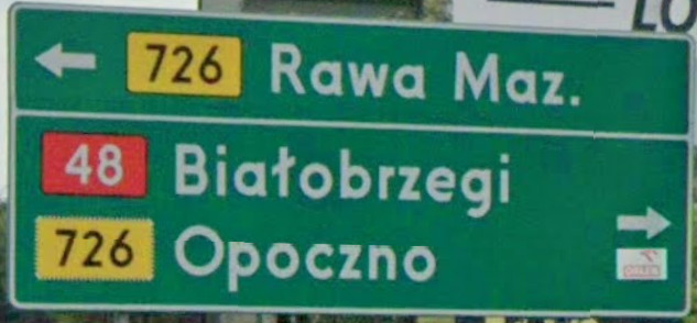 W tym przykładzie wzrok kierowcy jest przyciągany do czerwonej tabliczki drogi krajowej 48 prowadzącej w kierunku Białobrzegów. Z