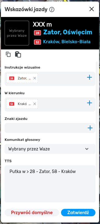 “Za XXX metrów skręć w prawo w Putka w kierunku 28 - Zator, 52 - Kraków”