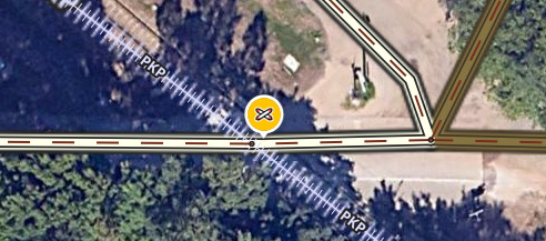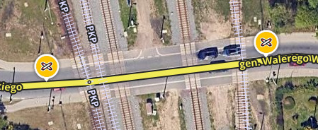 Powiadamia o przejazdach kolejowych z zaporami oraz bez. Ikona umieszczona jest w centrum przejazdu z ustawionym komunikatem dwukierunkowym.