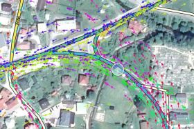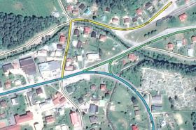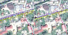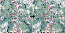 na vybrané miesto na zvislom úseku, použite zoom 7 až 8. Porovnajte jeho umiestenie s GPS stopami. Následne posúvaním podkladu v smere osi X (prvé pole) nájdite takú hodnotu pri ktorej sa bude čo najviac zhodovať umiestnenie cesty s polohou GPS bodov a tak aby bol ukazateľ SV nad cestou. Pri korekcii používajte krok ±5m namiesto predvolenej hodnoty ±10m. -